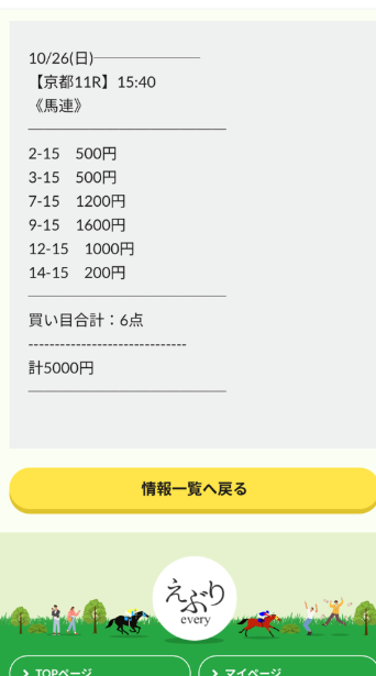 菊花賞の馬連1600円で買ってたから勝てました! このえぶりの予想見ておいたおかげなんですけどね(´▽`) ありがとうございました。