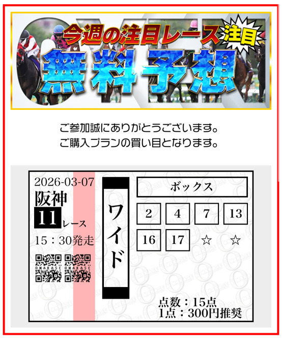 運営さんも人間だから間違える事はあると思う。 ワイド5頭だと15点じゃなくて10点ですよ(笑) 点数は間違えてるけど買い目はドンピシャ! 2026年を占う中山金杯、その無料予想で 1着~3着ドンピシャ! これなら3連単456倍も付いたから買っておけばよかった 来週はフェアリーステークス出すみたいだから重賞的中頼んだ! 次は3連単も買う!