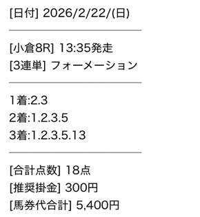 G1裏開催の小倉、高配当当ててもらいましたわ。 G1はガチガチだったし、こっちも買っておいてよかった。 5400円の馬券代、点数18点で1475850円的中。 気になるサイトではあったから1度は使ってみたいと思っていたけど使って正解でした。